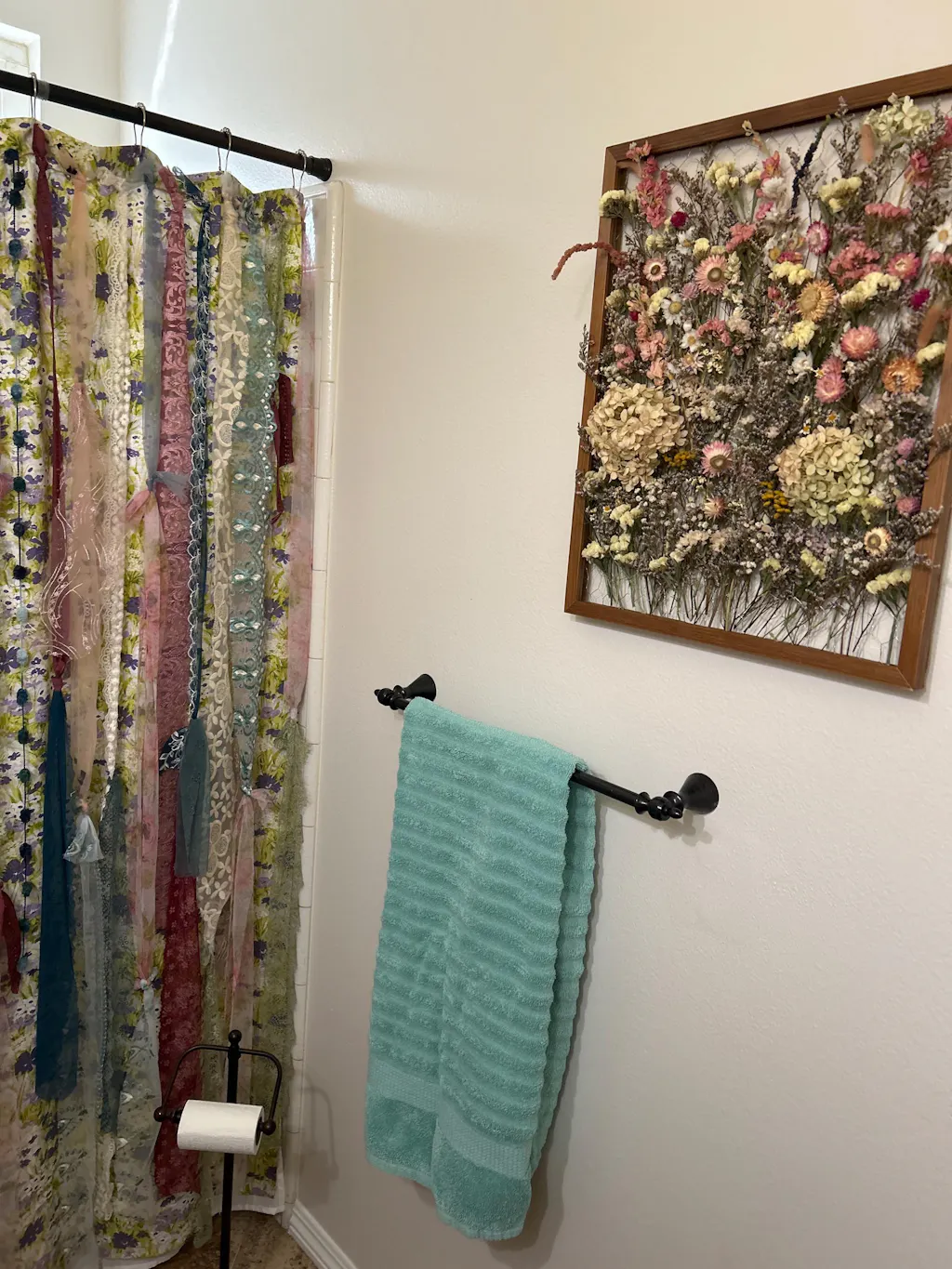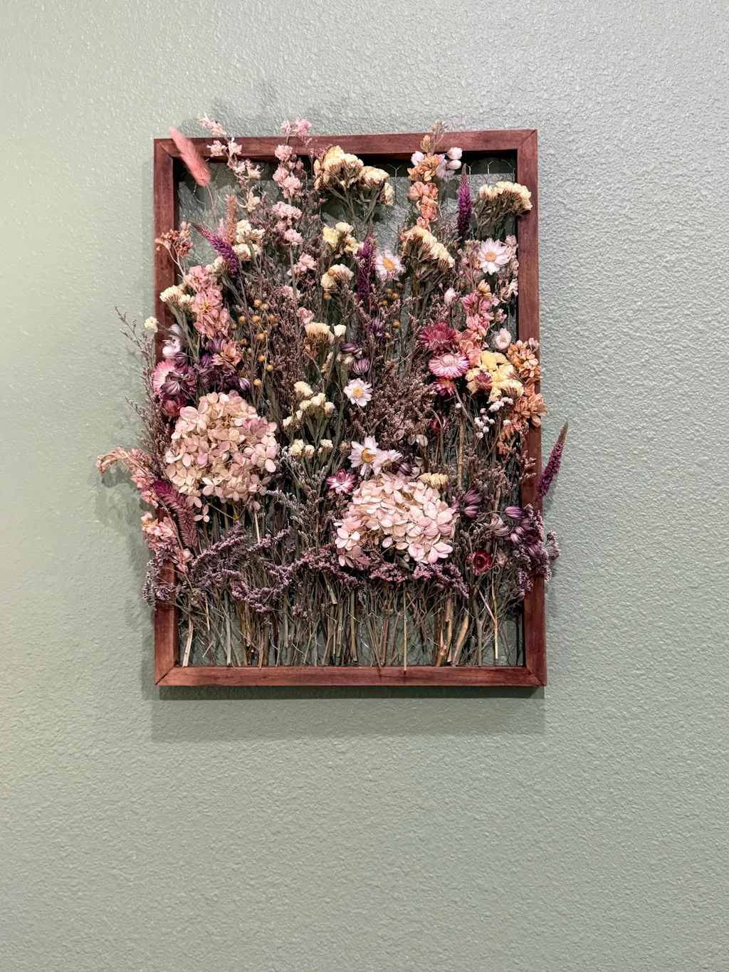 A one-of-a-kind wall art piece. A new way to enjoy dried botanicals in your home decor. This custom made wooden frame, holds beautiful dried botanicals secured by a metal netting. From soft pastel hued statice and hydrangeas to vibrant hued strawflowers. This meadow-inspired Botanical Frame is handmade to order and designed to be a show stopper on every wall you display it on.